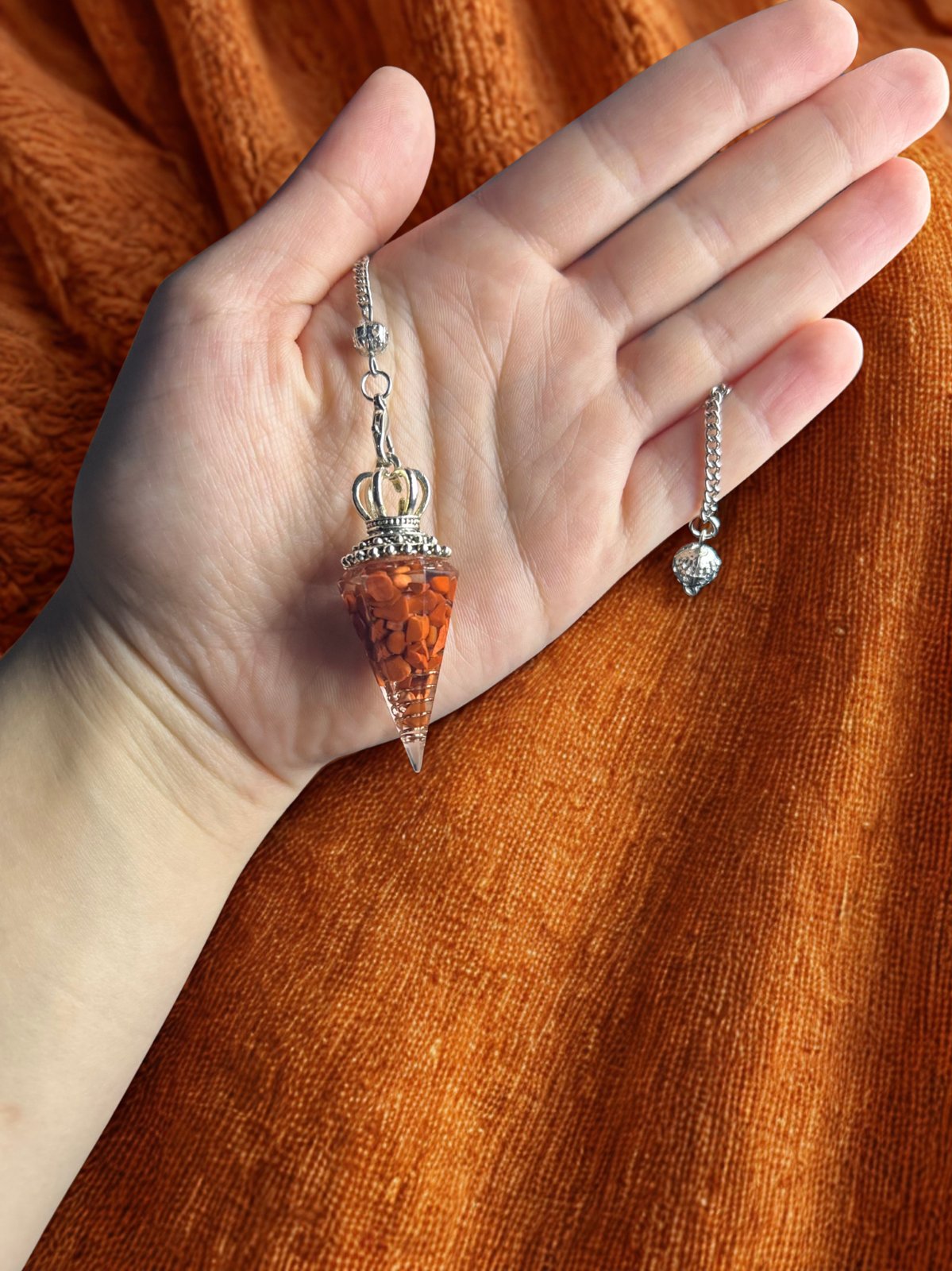 Le pendule Solarius est un véritable concentré de vitalité et de passion. Sa pointe facettée, ornée d’une couronne argentée royale, est composée de fragments de pierre orange travaillés en laboratoire, capturant toute l’énergie solaire et la puissance du feu.